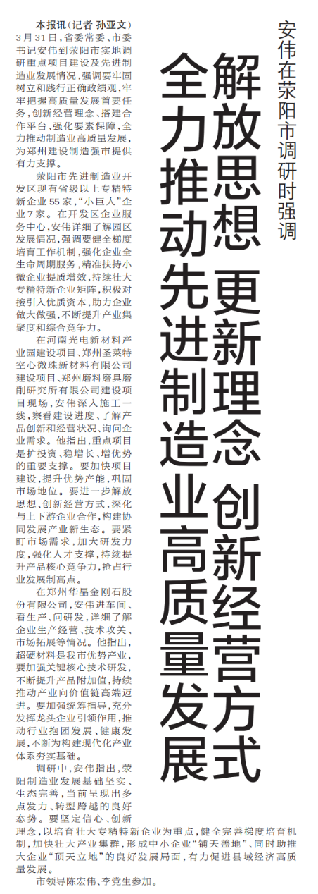 3月31日,省委常委、市委书记安伟到荥阳市实地调研重点项目建设及先进制造业发展情况,强调要牢固树立和践行正确政绩观,牢牢把握高质量发展首要任务,创新经营理念、搭建合作平台、强化要素保障,全力推动制造业高质量发展,为郑州建设制造强市提供有力支撑。(今日《郑州日报》1版)