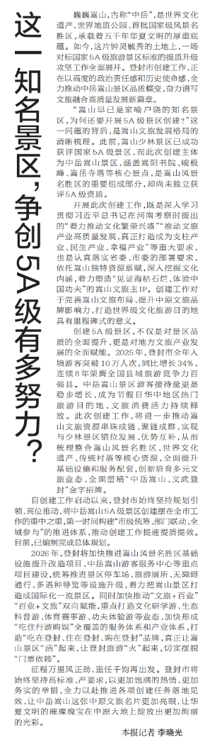 巍巍嵩山,古称“中岳”,是世界文化遗产、世界地质公园、首批国家级风景名胜区,承载着五千年华夏文明的厚重底蕴。如今,这片钟灵毓秀的土地上,一场对标国家5A级旅游景区标准的提质升级攻坚工作全面展开。登封市创建工作,正在以高度的政治责任感和历史使命感,全力推动中岳嵩山景区品质蝶变,奋力谱写文旅融合高质量发展新篇章。(今日《郑州日报》2版)