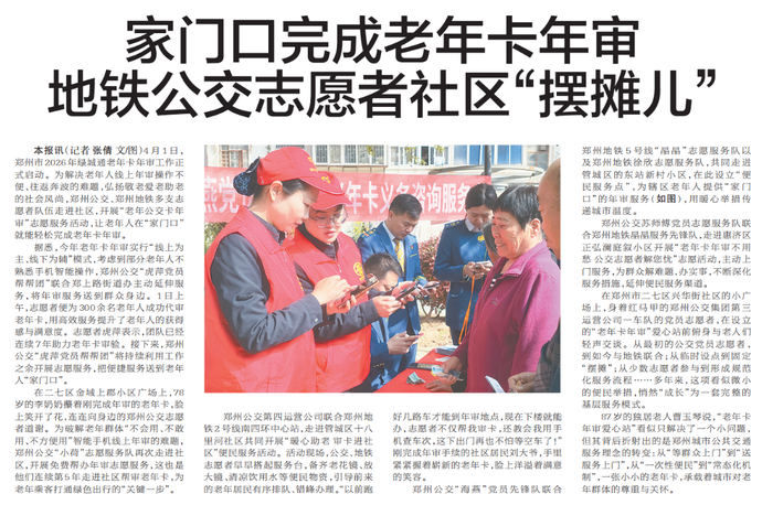 4月1日,郑州市2026年绿城通老年卡年审工作正式启动。为解决老年人线上年审操作不便、往返奔波的难题,弘扬敬老爱老助老的社会风尚,郑州公交、郑州地铁多支志愿者队伍走进社区,开展“老年公交卡年审”志愿服务活动,让老年人在“家门口”就能轻松完成老年卡年审。(今日《郑州日报》5版)