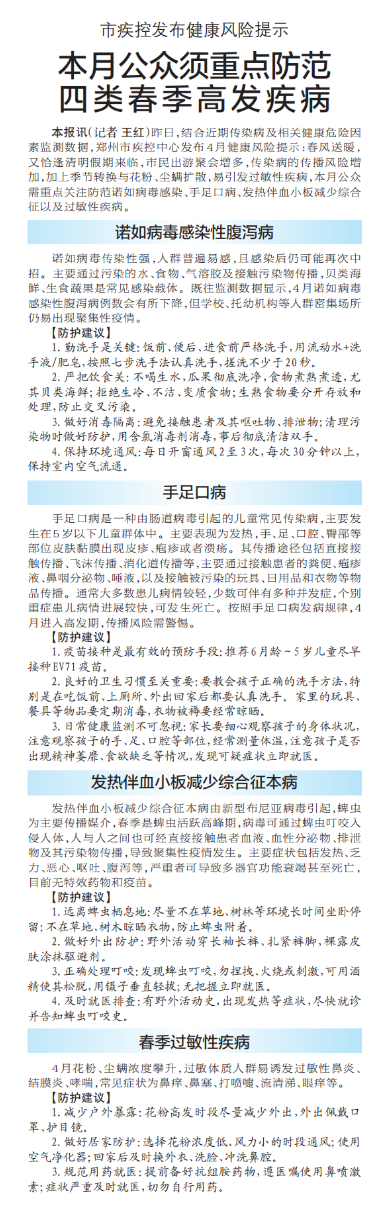 昨日,结合近期传染病及相关健康危险因素监测数据,郑州市疾控中心发布4月健康风险提示:春风送暖,又恰逢清明假期来临,市民出游聚会增多,传染病的传播风险增加,加上季节转换与花粉、尘螨扩散,易引发过敏性疾病,本月公众需重点关注防范诺如病毒感染、手足口病、发热伴血小板减少综合征以及过敏性疾病。(今日《郑州日报》5版)