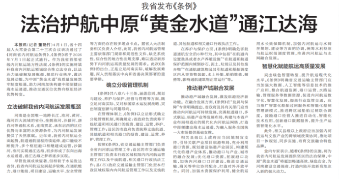 4月1日,省十四届人大常委会第二十三次会议表决通过了《河南省内河航运条例》,《条例》将于2026年7月1日起正式施行。作为我省首部省级内河航运地方性法规,《条例》的实施将填补我省内河航运领域综合性立法空白,以法治力量破解发展瓶颈、规范行业秩序、激活发展动能,为中原“黄金水道”高质量发展筑牢制度根基,助力河南加快构建中部便捷出海水运通道,推动交通区位优势向枢纽经济优势转变。(今日《郑州日报》6版)