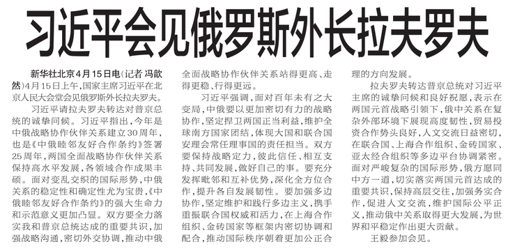 4月15日上午,国家主席习近平在北京人民大会堂会见俄罗斯外长拉夫罗夫。