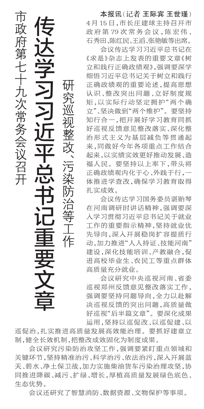 4月15日,市长庄建球主持召开市政府第79次常务会议,陈宏伟、石秀田、陈红民、王滔、张艳敏等出席。
