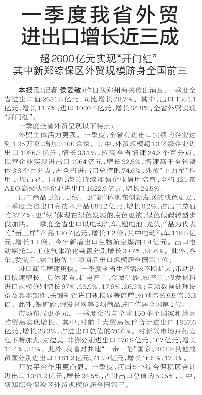 昨日从郑州海关传出消息,一季度全省进出口值2631.5亿元,同比增长28.7%。其中,出口1551.1亿元,增长11.7%;进口1080.4亿元,增长64.8%,全省外贸实现“开门红”。(今日《郑州日报》1版)