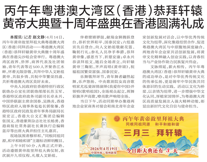 4月14日,丙午年黄帝故里拜祖大典粤港澳大湾区(香港)同拜活动——粤港澳大湾区(香港)恭拜轩辕黄帝大典暨十周年盛典在香港尖沙咀会堂举行。粤港澳大湾区政界、侨界、商界代表及社团领袖、青年代表等近500人齐聚香江水畔,怀着无限崇敬,共拜中华人文始祖黄帝、共叙乡情、共祝中华繁荣昌盛、共祈粤港澳大湾区美好未来。(今日《郑州日报》1版)