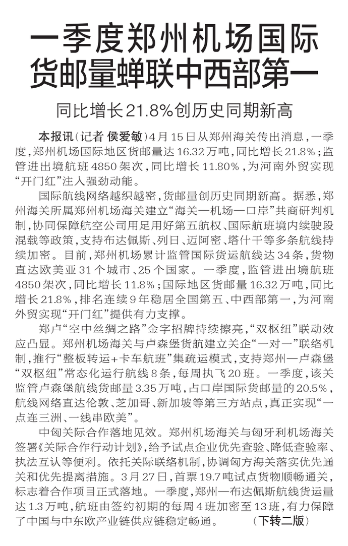 4月15日从郑州海关传出消息,一季度,郑州机场国际地区货邮量达16.32万吨,同比增长21.8%;监管进出境航班4850架次,同比增长11.80%,为河南外贸实现“开门红”注入强劲动能。(今日《郑州日报》1版、2版)