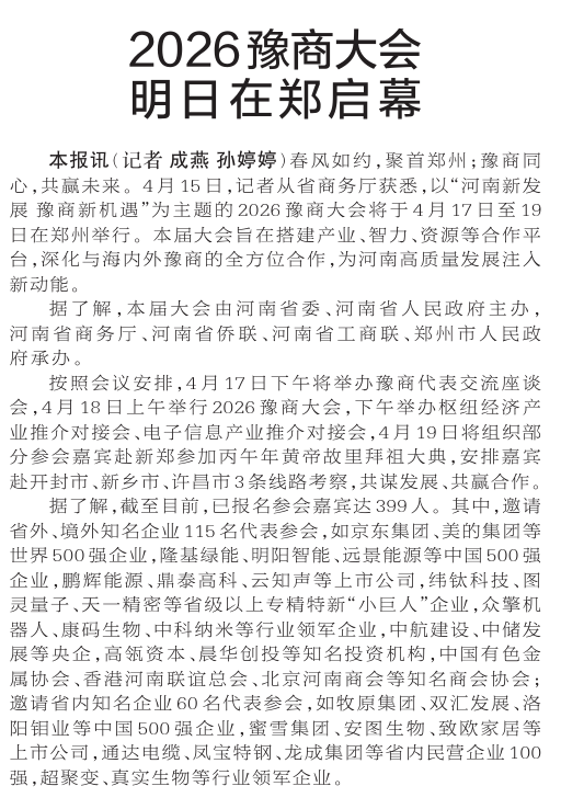春风如约,聚首郑州;豫商同心,共赢未来。4月15日,记者从省商务厅获悉,以“河南新发展 豫商新机遇”为主题的2026豫商大会将于4月17日至19日在郑州举行。本届大会旨在搭建产业、智力、资源等合作平台,深化与海内外豫商的全方位合作,为河南高质量发展注入新动能。(今日《郑州日报》2版)