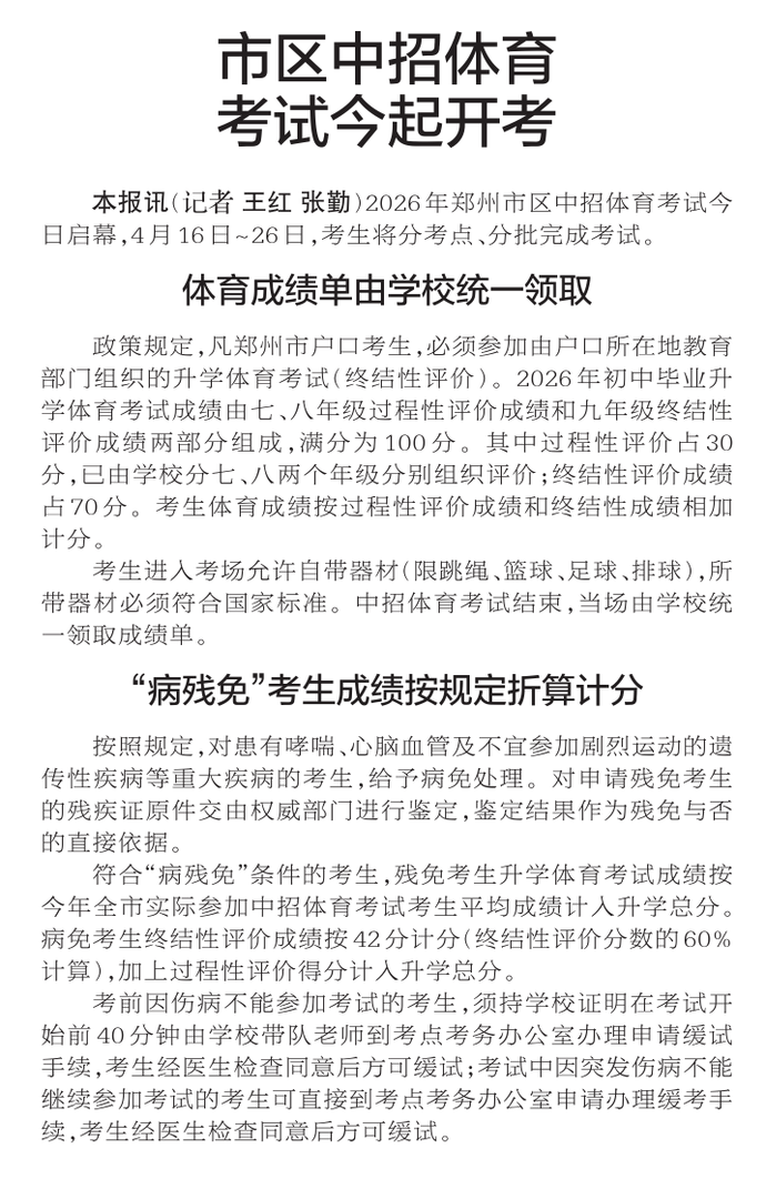 2026年郑州市区中招体育考试今日启幕,4月16日~26日,考生将分考点、分批完成考试。(今日《郑州日报》2版)
