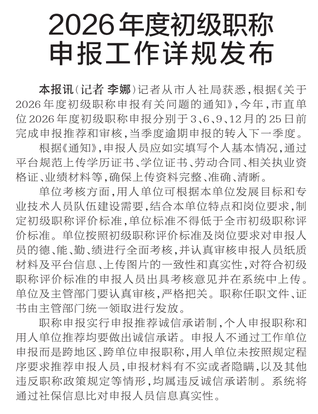 记者从市人社局获悉,根据《关于2026年度初级职称申报有关问题的通知》,今年,市直单位2026年度初级职称申报分别于3、6、9、12月的25日前完成申报推荐和审核,当季度逾期申报的转入下一季度。(今日《郑州日报》2版)
