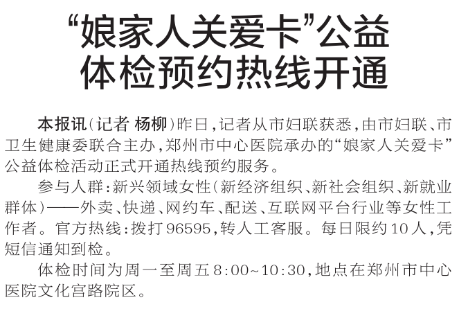 昨日,记者从市妇联获悉,由市妇联、市卫生健康委联合主办,郑州市中心医院承办的“娘家人关爱卡”公益体检活动正式开通热线预约服务。(今日《郑州日报》2版)