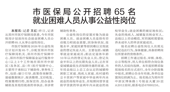 昨日,记者从郑州市医疗保障局获悉,今年市医保局计划面向社会就业困难人员公开招聘65人从事公益性岗位。(今日《郑州日报》2版)