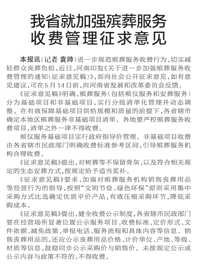 进一步规范殡葬服务收费行为,切实减轻群众丧葬负担,近日,河南印发《关于进一步加强殡葬服务收费管理的通知(征求意见稿)》,面向社会公开征求意见,如有意见建议,可在5月14日前,向河南省发展和改革委员会反馈。(今日《郑州日报》2版)