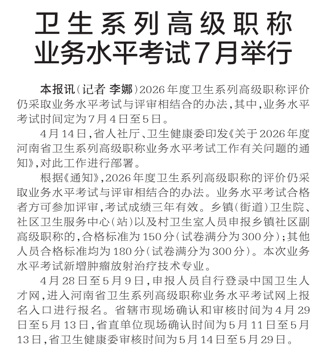 2026年度卫生系列高级职称评价仍采取业务水平考试与评审相结合的办法,其中,业务水平考试时间定为7月4日至5日。(今日《郑州日报》2版)