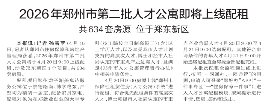 4月15日,记者从郑州市住房保障和房地产管理局获悉,2026年郑州市第二批人才公寓将于4月20日9:00上线配租,涉及郑东新区1个项目,共634套房源。(今日《郑州日报》2版)