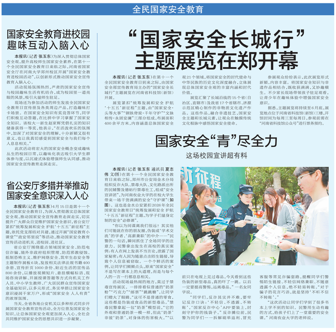 为深入贯彻总体国家安全观,提升高校师生国家安全素养,在第十一个全民国家安全教育日来临之际,河南省国家安全厅在河南大学郑州校区开展“国家安全教育进校园活动”,以创新形式推动国家安全宣传教育入脑入心。(今日《郑州日报》5版)
