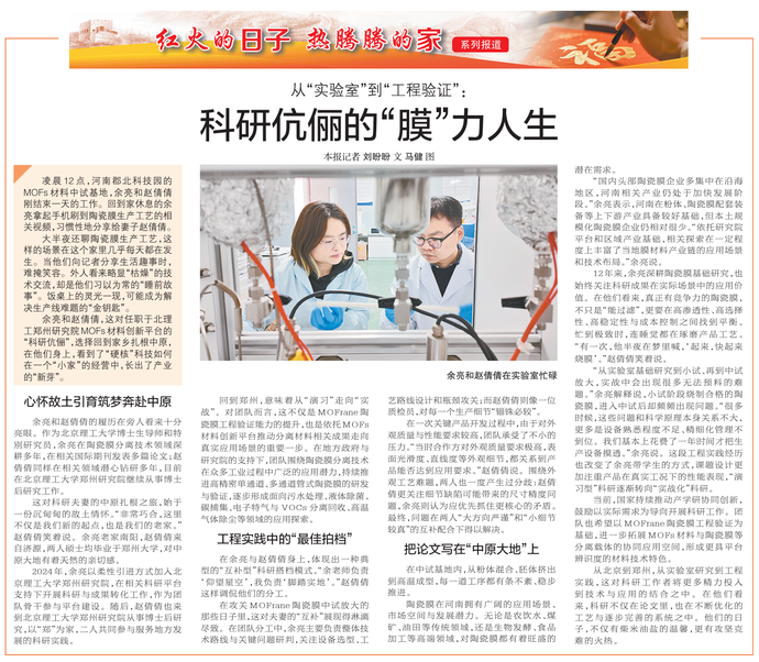 凌晨12点,河南郡北科技园的MOFs材料中试基地,余亮和赵倩倩刚结束一天的工作。回到家休息的余亮拿起手机刷到陶瓷膜生产工艺的相关视频,习惯性地分享给妻子赵倩倩。(今日《郑州日报》5版)