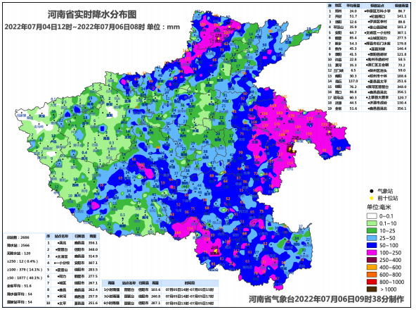 二是大暴雨范围广。全省有123个县(市、区)共1077个雨量站降水量超过50毫米,其中100毫米以上的有62个县(市、区)共379站,大于250毫米的有7个县(市、区)共12站,商丘和安阳大部、周口中东部、鹤壁西北部、信阳西部、南阳东部出现区域性大暴雨,周口、信阳、安阳、鹤壁局地出现特大暴雨。