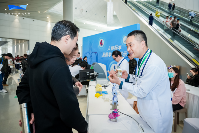 在场馆中庭,河南省科技馆首次举办的健康文化市集热闹非凡,吸引广大观众纷纷驻足。本次市集联动省卫健委、河南中医药大学、阜外华中心血管病医院、郑州市生命与健康科学馆以及省内各级科普场馆,共同打造集中医特色健身功法、中医特色诊疗体验、中医药产品展示和中西医药文化科普等多元化为一体的健康文化市集。现场观众可以在互动体验的同时,加深对中医药历史、文化的了解,从而更加深入地体会中医药的魅力。