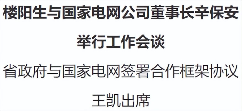 12月18日,省委书记楼阳生与国家电网有限公司董事长、党组书记辛保安一行在郑州举行工作会谈,共同见证省政府与国家电网有限公司签署加快构建河南新型电力系统合作框架协议。省长王凯出席。